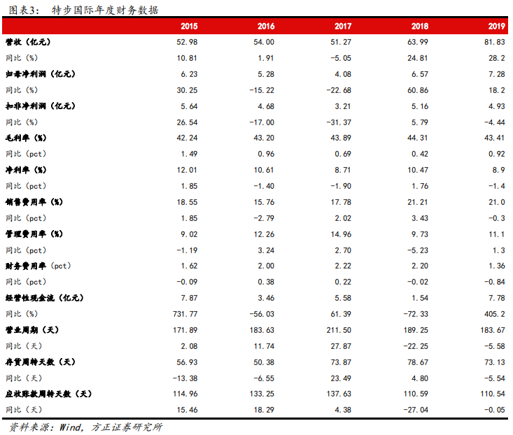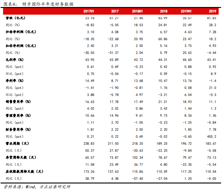 (1)2019年主品牌稳健,盈利略超预期。公司主品牌产品持续升级叠加新品牌增量,2019年营收增长达28.2%,维持较高增速。其中特步主品牌2019年收入增20.7%,发展迅速。因包含政府补贴、卖地收入等的其他收入提升,盈利略超预期,扣除1亿元收购费用影响后,经营利润、归母净利润增速分别达27.8%、26%,维持高速增长。