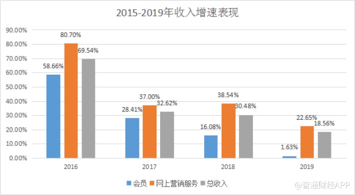 2015-2019年间,常年占据公司90%以上收入的会员、网上营销服务业务收入增速正出现连续下滑,其中会员业务收入增长更是出现肉眼可见的放缓。2019年,两项业务收入占比已由2015年的95.5%下降至93.9%,其中会员收入占比则由41.54%下降至了28.70%。