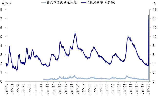 此外,细看此次数据,还呈现几个特点,即受卫生事件影响严重和暂时性失业(所谓furlough)占比较高。具体而言,休闲和酒店(765万人)、教育和医疗保健服务(254万人)、专业和商业服务(213万人)、零售(211万人)、其他服务业(127万人)就贡献了77%的就业损失。同时,~78%的失业为所谓的临时性停工而非永久性失业,因此市场预期一旦开始复工进入正轨,就业市场的修复速度可能也会相对比较快。