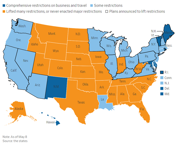 截止5月8日,美国已经有25个州取消了大部分的封锁限制措施,还有约19个州部分取消封锁限制(包括加州和纽约州),余下依然完全采取全面封锁态势的州仅占少数。此外,根据媒体报道,苹果将于下周在部分州开启其线下零售店[1]、美国国务院也在有条件的重新复工[2]。