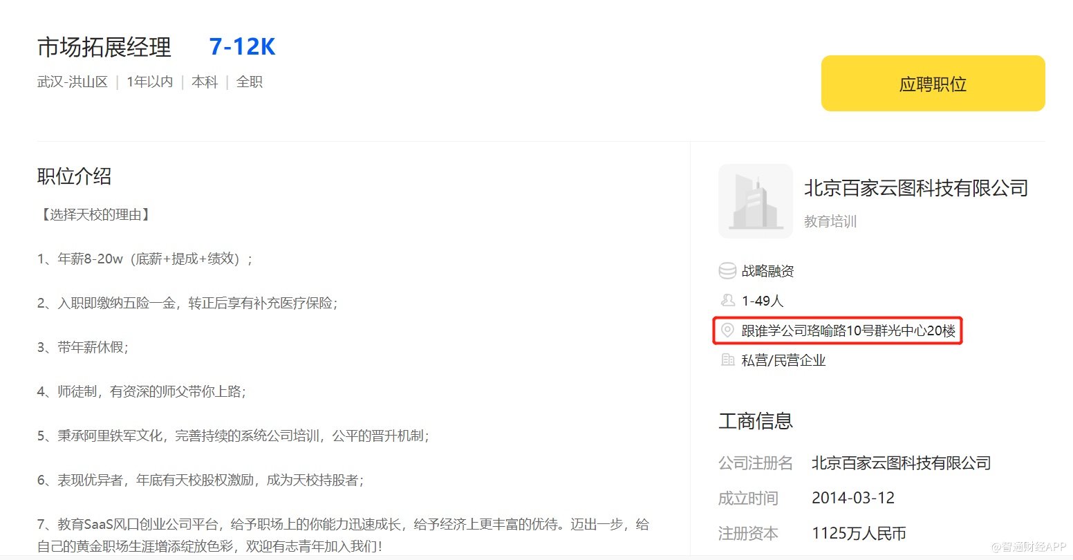 其二,香橼认为跟谁学两年前已完全出售的北京百家云图科技有限公司至今仍与跟谁学紧密合作。其理由为在北京百家云图科技于2020年4月16日发布的招聘信息中,工作地址显示的是跟谁学的武汉办事处。