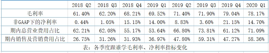 市场中不少声音对跟谁学的高毛利较为怀疑,事实上,高毛利并不是最匪夷所思的点,双师制大班课有这样的毛利并不奇怪,在已搭建好的平台上,学生人数越多,规模效应也就越明显,20个学生与200个学生所需的成本差距很小,但收入规模却可达到10倍之差,跟谁学的毛利率也随着规模的增长逐渐提高,至2020年第一季度时,其毛利率为78.17%。