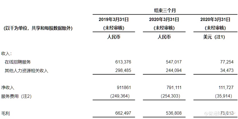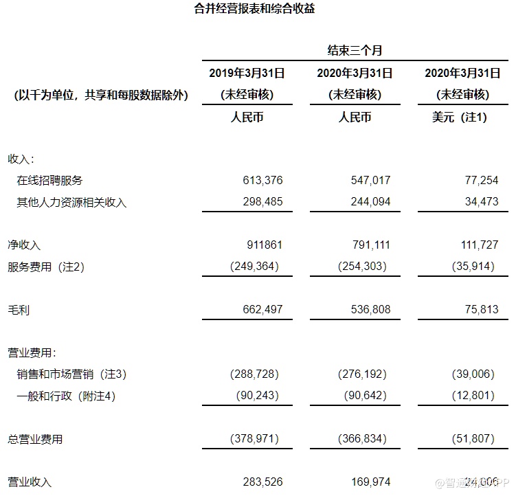 受公共卫生事件影响,2020年Q1,前程无忧整体营收为7.91亿元,同比下滑13.2%;但当期净利润却实现扭亏为盈,达到2.05亿元。