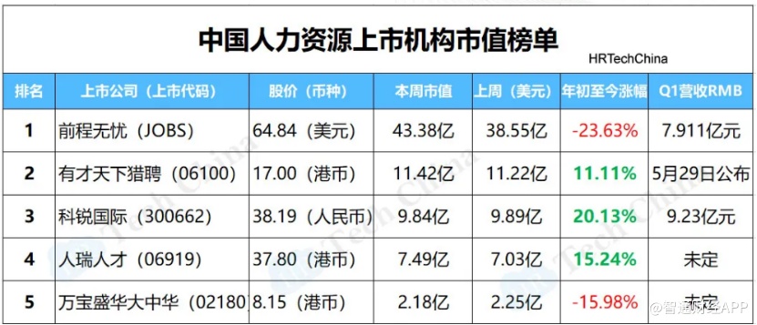在国内市场,猎聘主攻高端人才在线招聘,科锐和人瑞人才则在灵活用工领域持续抢夺中高端招聘市场。在国内前4家上市的招聘公司中,仅有前程无忧年初至今涨幅下跌23.63%,其余三家均超过了10%以上的涨幅,这足以从侧面说明其对前程无忧市场份额的冲击。但作为国内最大的综合HR服务提供商,前程无忧最大的底牌还是在国内招聘市场的渗透力度。