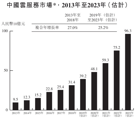 根据弗若斯特沙利文数据显示,自2013年至2018年,企业云服务市场规模快速增长,由95亿元增至314亿元,复合年增长率为27.0%。随着物联网及人工智能等相关技术的快速发展,加上IT基础设施的快速升级,云服务市场本就在延续着高速发展。市场规模预期将由2019年392亿元增长至2023年的963亿元,复合年增长率为25.2%。