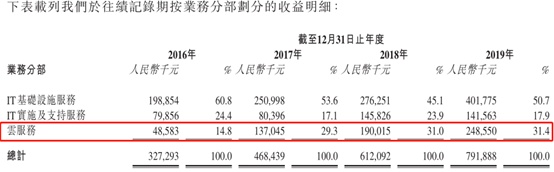 公司财务数据显示,云服务业务2016年-2019年年度营收贡献,分别为4858.3万元人民币(单位下同)、1.37亿元、1.9亿元和2.49亿元,四年期间的年均复合增长率高达72.31%,营收占比也从2016年的14.8%大幅提升至2019年的31.4%。而且,公司聆讯时更新的招股说明书中提到,截至2019年12月31日止四个年度及自2020年1月1日起直至最后实际可行日期,各期间订购公司云服务的活跃客户数目为43名、81名、132名、179名及229名。其中2017、2018、2019年度活跃客户数目分别增长38名、51名、47名,2020年仅过去不到4个月,活跃客户数目较2019年底已经增加50名,足以反映公司云业务2020年增速大幅提升的态势。