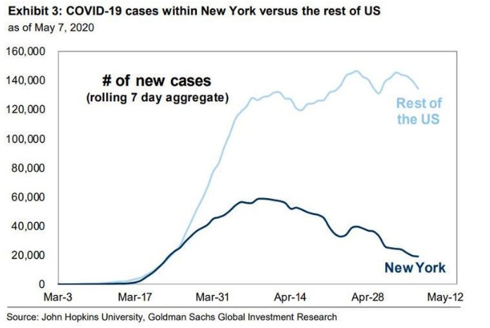 首先,纽约以外地区的COVID-19感染率继续上升。值得庆幸的是,纽约能够拉平这条曲线,新病例的增长率也有所下降,而美国其他地区的新感染病例却在增加。随着各州开始放宽就地避难的规定,感染病例可能会加速增加。