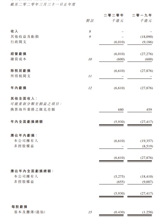 截至2020年3月31日止年度,该公司产生亏损约661万港元,而截至该日,该公司流动负债净额及亏绌总额分别约为1.43亿港元及1.67亿港元。此数据表明有存在可使该企业能否持续经营重大不明朗因素。