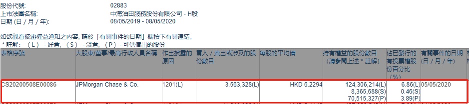 智通财经APP获悉,联交所最新资料显示,5月5日,摩根大通减持中海油田服务(02883)356.3328万股,每股作价6.2294港元,总金额约为2219.74万港元。减持后最新持股数目约为1.24亿股,最新持股比例为6.86%。