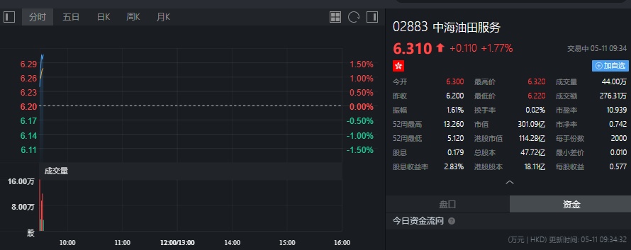 截至发稿,中海油田服务涨1.77%,报6.31港元。