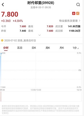 智通财经APP获悉,时代邻里(09928)早间发布公告,拟1486.81万人民币收购广州市耀城物业管理全部股权。该股早盘以7.82港元刷新上市新高,截至9时35分,涨4.84%,报价7.8港元,成交额1100.26万。