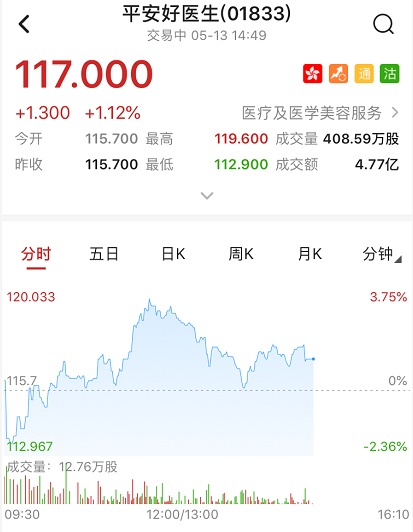 智通财经APP获悉,受上海市推进互联网医疗发展影响,平安好医生(01833)再度走强,盘中曾一度超3%,高见119.6港元。截至14时31分,涨1.38%,报价117.30港元,成交额4.65亿港元。