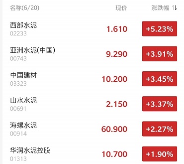 截至发稿,西部水泥(02233)涨4.58%,报1.6港元;亚洲水泥(中国)(00743)涨3.91%,报9.29港元;中国建材(03323)涨3.65%,报10.22港元;山水水泥(00691)涨3.37%,报2.15港元。