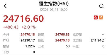 智通财经APP获悉,恒指早盘高开高走,盘中涨超500点,蓝筹股全线走强。截至发稿,恒指涨2.01%,报24716.6点,成交额暂为241.94亿港元。