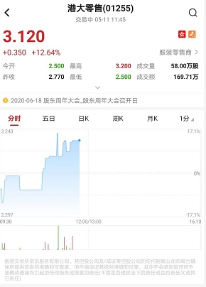 智通财经APP获悉,港大零售(01255)于上周五(5月8日)发布公告,控股股东所持56.07%公司股份被接管,今日复牌,股价大幅上扬,截至11时45分,涨12.64%,报价3.12港元,成交额169.71万。