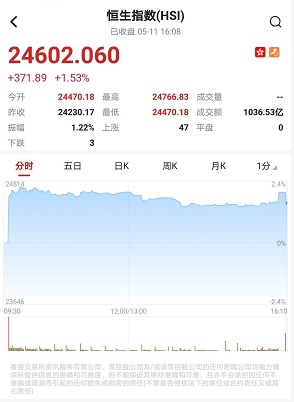 智通财经APP获悉,恒指早盘报高开240.01点或0.99%,报24470.18点。截至收盘,恒生指数涨371.89点或1.53%,报24602.06点,全日成交额达1036.53亿。国企指数涨1.24%,报9990.48点,红筹指数涨0.76%,报3852.79点。