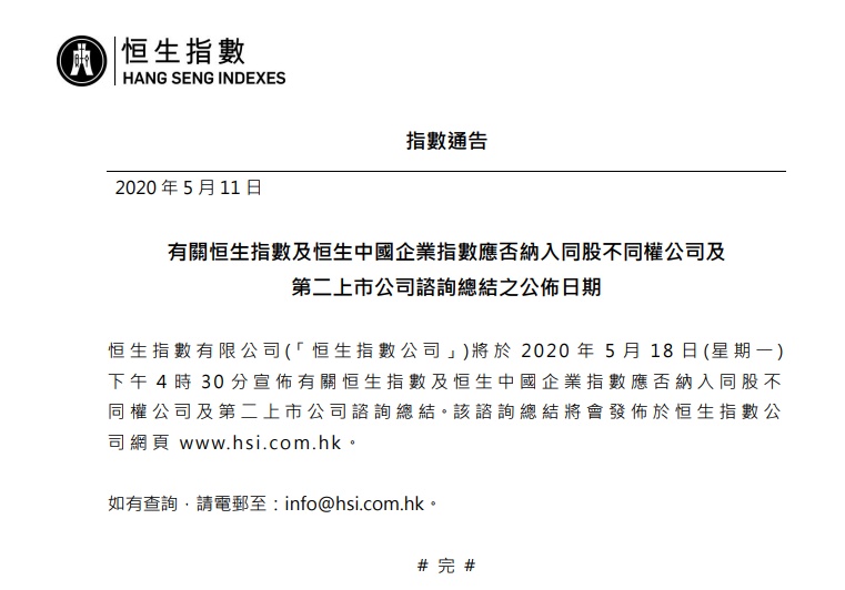 智通财经APP获悉,恒指公司今日(5月11日)发布公告称,将于星期一(5月18日)下午4时30分宣布有关恒生指数及恒生中国企业指数应否纳入同股不同权公司及第二上市公司咨询总结。