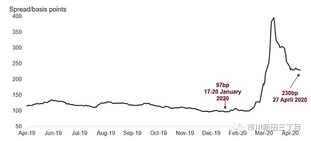 到四月末为止新发公司债的风险溢价水平较前期大为缩水,在某些发行案例中,比如星座酒业和礼来制药公司新发债券的票面利率实际上要高于尚未到期债券的收益率,因为投资者更多的担忧自己是否有能力拿出足够的资金买入债券而不是票息的高低。但这个情况必须被放在对美国债券市场的整体估值中进行考量,下图显示4月27日美国投资级公司债的信用利差为230个基点,而1月份的时候则低至只有97个基点。
