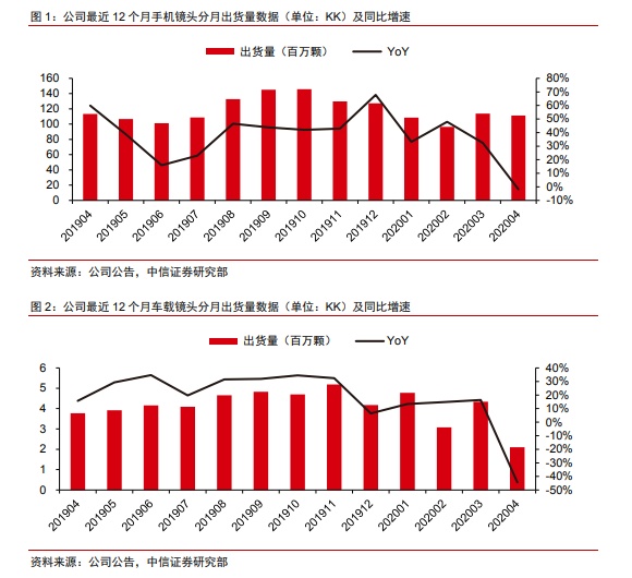 车载镜头 4 月出货量同比-44.4%,受海外公共卫生事件影响延迟发货。公司车载镜头 4 月出货 209.8 万件,同比-44.4%,环比-51.6%;2020 年 1-4 月累计出货 1,428.5 万件,同比-0.7%,主要源于欧洲自 3 月下旬起已有超过 70 座整车厂因公共卫生事件关闭,直到 4 月下旬才出现起亚、现代等第一批决定恢复生产的品牌,生产停滞近 1 月,造成公司车载镜头延迟发货。由于部分复产车厂由三班制改为两班制,或仅恢复部分车型的生产,我们认为二季度车载市场仍将处于淡季;但考虑到公司并未遭遇终端砍单,若海外公共卫生事件得到控制,下半年车载镜头出货随欧洲车厂陆续复工有望重回增长,我们将持续追踪相关情况。长期来看,预计公司仍将受益于车载摄像头领域持续发展,考虑车载成像领域及 ADAS 快速成长及公司车载镜头全球市占率第一的领先地位,全年出货量增速有望持续高于行业平均水平。