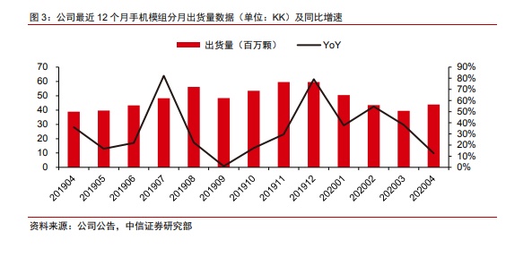 手机摄像模组 4 月出货量同比+12.7%,高端产品毛利率有望改善。公司 4 月 CCM 出货 4,381.9 万件,同比+12.7%,环比+11.1%;2020 年 1-4 月累计出货 17,718.6 万件,同比+34.0%,主要源于手机模组份额的上升。公司产线优化逐渐落地,自动化水平稳步提升,高规格新品良率持续提升,产品结构持续升级,潜望及大像面模组占比提升,因此高端产品毛利率今年有望继续改善。此外,其他光电产品 4 月出货 348.6 万件,同比-19.9%,环比+41.5%,3D Sensing 相关产品增速放缓,我们认为主要源于相关大客户一季度全球销量下滑 17%,其中海外销量下滑明显,同比-36%。