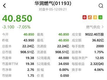 智通财经APP获悉,华润燃气(01193)发布公告称,拟以每股40.81港元配售9000万股股票,较上一交易日收盘价折让7.14%,净筹资约36.73亿港元。所得款项净额用于收购更多下游城市燃气分销业务及补充公司一般营运开支。该股市前现一宗大手成交,涉资36.73亿港元,或为该配售上板。截至发稿,华润燃气跌7.05%,报40.85港元,成交额36.82亿港元。