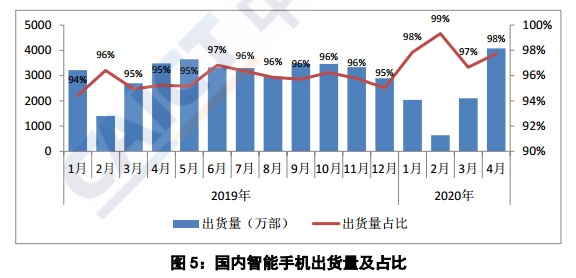 2020年4月,智能手机出货量4078.2万部,同比增长17.2%,占同期手机出货量的97.7%。1-4月,智能手机累计出货量8851.8万部,同比下降17.9%,占同期手机出货量的97.6%。