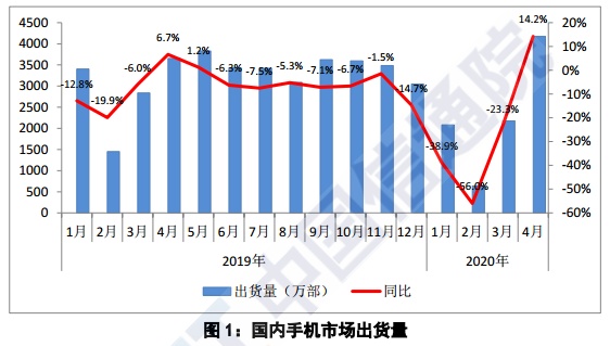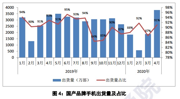2020年4月,国产品牌手机出货量3798.2万部,同比增长11.9%,占同期手机出货量的91.0%;上市新机型44款,同比增长25.7%,占同期手机上市新机型数量的91.7%。