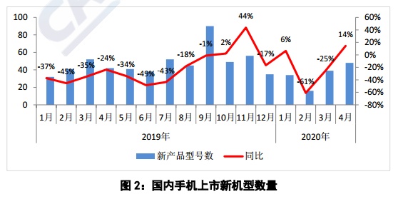4月,国内手机上市新机型48款,同比增长14.3%。1-4月,上市新机型累计137款,同比下降18.0%。