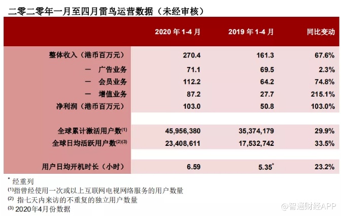 2020年一至四月雷鸟网络科技实现收入2.7亿港元,同比显著增长67.6%,其中会员业务及增值业务收入分别同比大幅提升74.8%及215.1%,且增值业务收入占比提升15个百分点至32.2%。首四个月雷鸟网络科技净利润达1.0亿港元,同比大幅增长103.0%;净利率为38.1%,同比显著提升6.6个百分点,其盈利能力进一步增强。