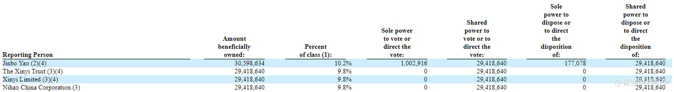 在上述的30,598,634股普通股中,包括了由Nihao China Corporation持有的28,587,204股B类普通股和831,436股A类普通股(代表415,718股ADS)、由一些高管及雇员持有的1,002,916股B类普通股、以及在本文件签订之日起60天内,通过转换限制性股票单位向姚劲波先生发行的177,078股A类普通股。(注:1股ADS代表2股A类普通股;A类股和B类股统称为普通股;A类普通股和B类普通股股东的权利相同,但转换权和投票权除外。每个B类普通股在持有者的选择权下可在任何时候转换为A类普通股。每个B类普通股每股有10张投票权,每个A类普通股每股有1张投票权。)