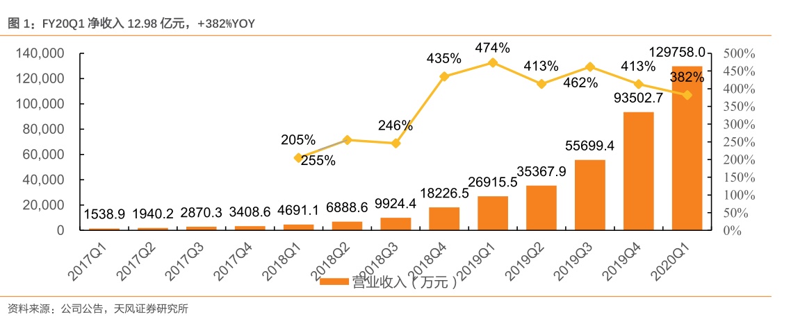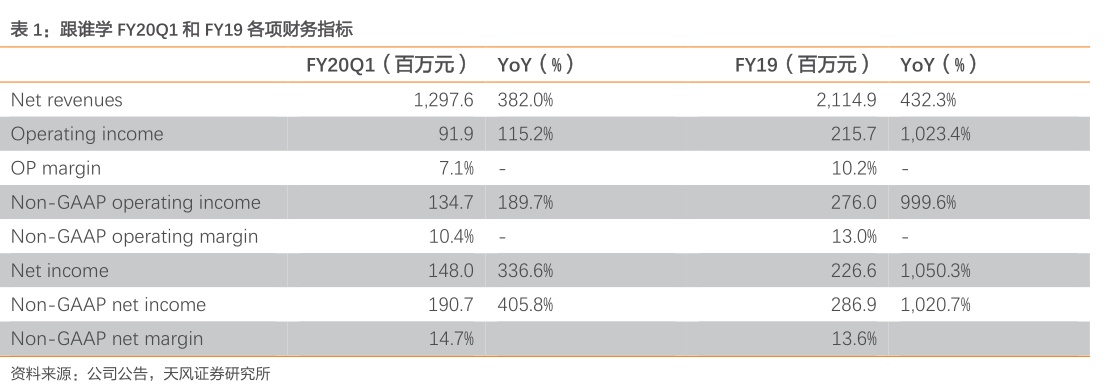 跟谁学(GSX.US)收入增长超预期:20Q1收入12.98亿元,+382%yoy。公司连续6个季度营收同比增速超350%。