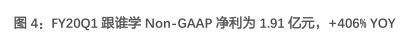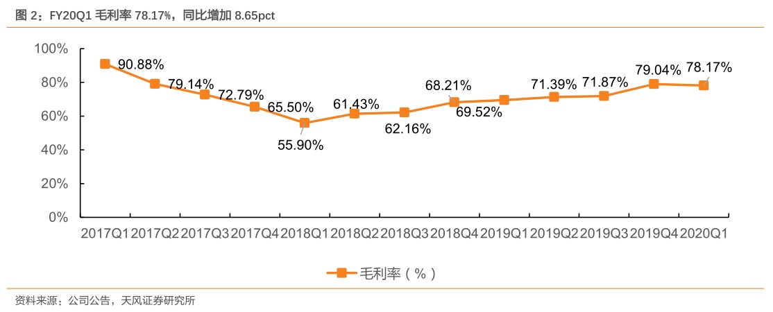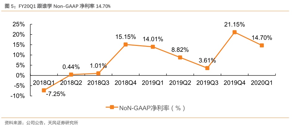 FY20Q1毛利率同比增加加8.65pct。FY20Q1跟谁学毛利10.14亿元,同比增长442.1%,毛利率78.17%,较FY19Q1的69.52%同比增长8.65pct。