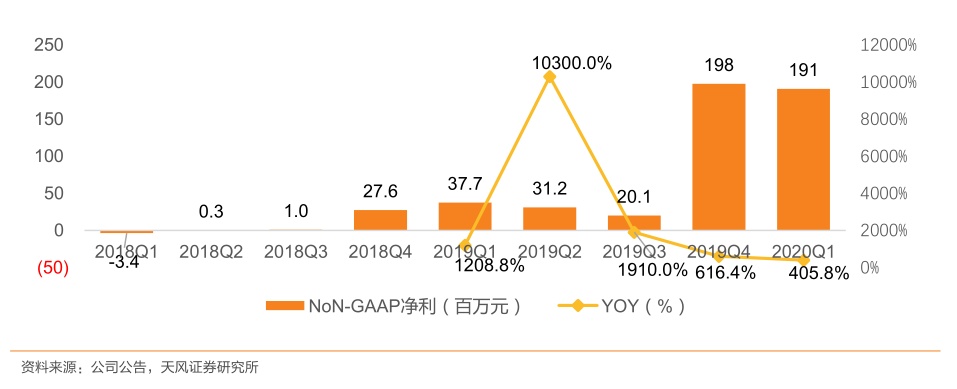 连续8个季度Non-GAAP盈利:20Q1Non-GAAP净利1.91亿元,+405.8%yoy。公司采用优化单个模型后规模化的策略,连续8个季度Non-GAAP盈利。