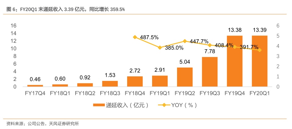递延收入:截至2020年3月31日,公司递延收入13.39亿元,同比增长359.5%。