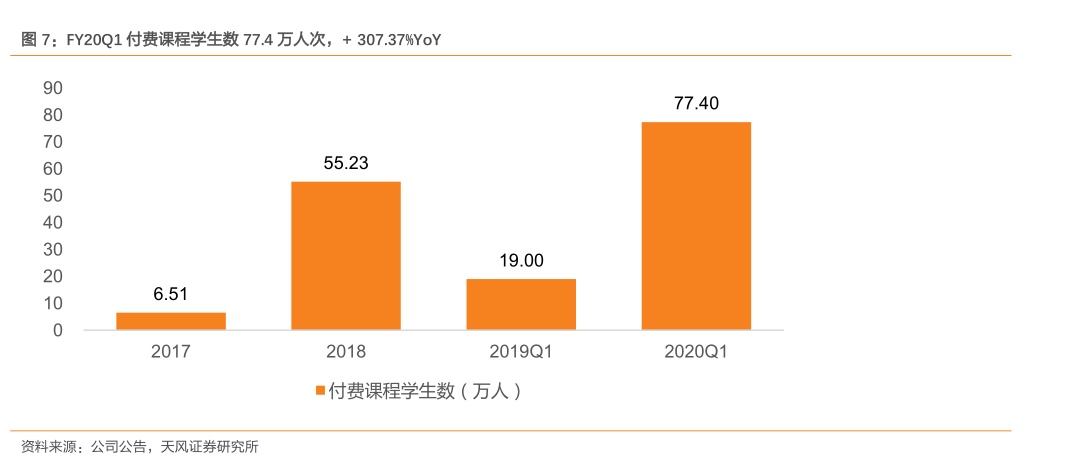 FY20Q1付费课程学生数77.4万人次,+307.37%YoY。