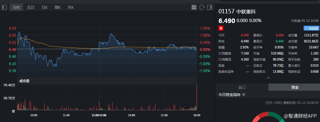 截至今日收盘,中联重科(01157)无涨跌,报6.49港元。
