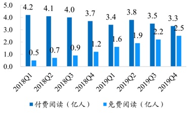 然而就最新情况来看,由于免费阅读与付费用户重合度较低,整个在线阅读市场天花板其实得到了提升。智通财经APP了解到,从当前数据分析得知,免费模式与付费模式在用户画像上存在较为明显的年龄、城市差异,免费模式的数字阅读用户预计有大量来自低线城市的“银发用户”。同时,免费阅读模式下,虽然内容本身不收取费用,但内容提供方通过APP页面广告进行变现。并且数据显示,近年来付费阅读确实因免费模式影响出现用户规模的部分下降,但是免费阅读规模迅速增长,由2018Q1仅0.5亿人增长至2019Q4的2.5亿人,整个在线阅读用户规模增长明显。