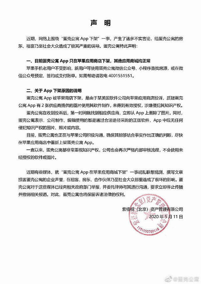 目前,蛋壳公寓也正在与苹果公司积极沟通,确保其能够结合事实作出正确的判断,争取尽快在苹果应用商店中重新上架蛋壳公寓App。