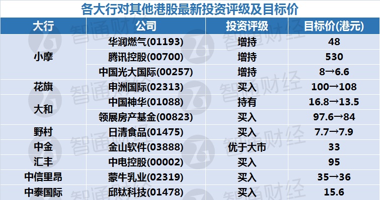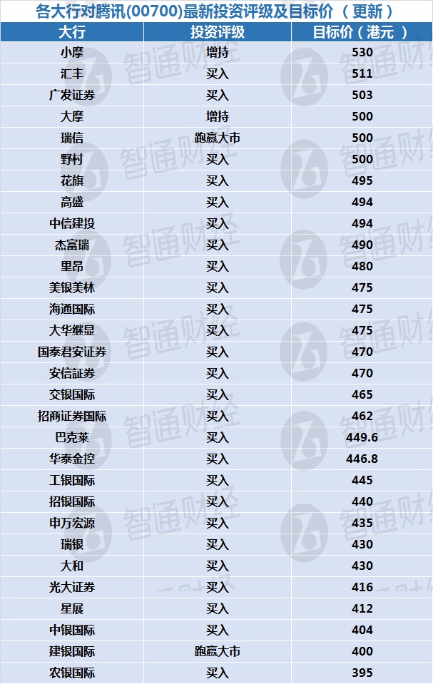 一、各大行对腾讯(00700)最新投资评级及目标价 (更新)