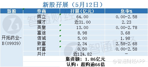 智通财经APP获悉,开拓药业-B(09939)正在招股中,截至5月12日,辉立、耀才、信诚等券商为其借出124.82亿港元,超购逾66倍。