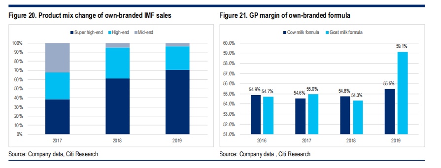2019年毛利润率的提高是由于产品组合的持续改善,超优质产品的销售增长更快,增值税下调降价导致税前价格上涨,以及销量增加带动单位制造费用降低所致。花旗银行认为,配方羊奶粉的细分市场已充分受益于这些因素,而配方牛奶粉市场部分受益于各个事业群之间的业绩差异。