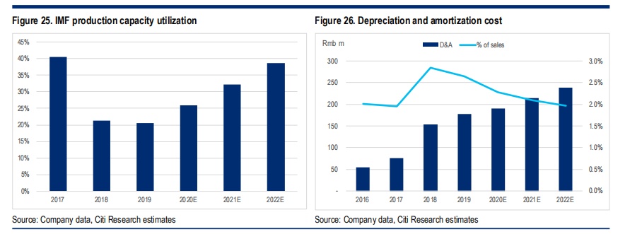 婴幼儿奶粉的总年产能从2016年的28000吨增加到2019年的168000吨。主要的增长是在2018年,当时荷兰有两家新工厂投入生产。由于利用率低下,2018年生产成本翻了一番,生产成本/销售额增长了1个百分点。此外,澳优在2018年和2019年的员工成本/销售额为16%,也远远高于同行,花旗银行认为, 这是由于生产方面的劳动力成本较高。据估计,2019年的利用率仅为20%左右。假设年产量增加20%以上。在2020-2022年,预计2022年的利用率将上升至36%,这将有助于减少生产成本和人工成本占销售额的百分比。