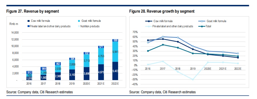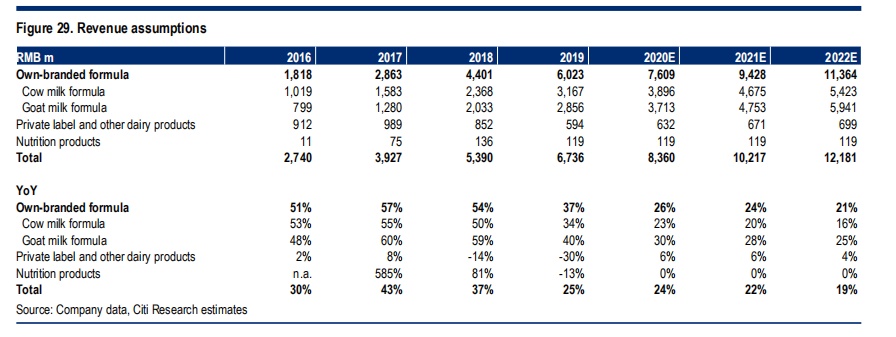 花旗银行预计集团收入在2019-2022年将以22%的复合年增长率增长,而2016- 2019年的复合年增长率为35%。按产品细分,预计自有品牌奶粉,自有品牌婴幼儿奶粉和其他乳制品以及营养产品的收入在2019-2023年的复合增长率分别为24%、6%和0%。在自有品牌配方牛奶粉中,预计2019-2023配方牛奶粉收入将以20%的复合年增长率增长,而2016-2019年度为46%,2019-2023年配方羊奶粉的复合年增长率将为28%, 而2016-2019年度为53%。