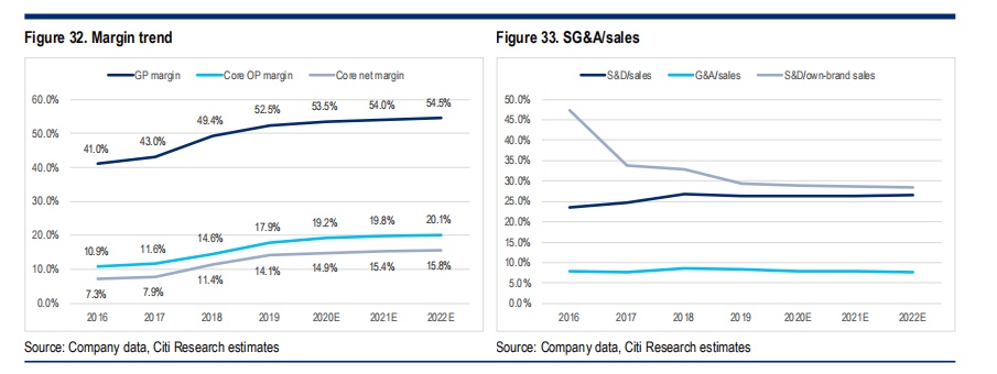 澳优的毛利润率从2016年的41%扩大到2019年的52.5%,这主要是由于业务结构的改善和自有品牌婴幼儿奶粉业务增长的推动。 毛利润率的显着增长带动同期核心运营利润率从11%增长至18%,核心净利润率从7%增长至14%。对于Kabrita和Hyproca BU这两个主要的收入来源,由于增值税削减和生产效率提高,2019年的净利润率也有所提高。展望未来,由于业务结构改善,产品结构升级和生产效率提高,花旗银行预计利润率将继续上升。