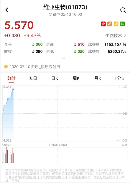 智通财经APP获悉,维亚生物(01873)近日宣布,附属与四川春秋订立施工合同,承包商已同意承接维亚生物新药孵化中心的施工工程,合同金额约为人民币1.5亿元。该利好持续发酵,维亚生物早盘逆市走强。截至发稿,涨9.43%,报5.57港元,成交额6260.27万港元。