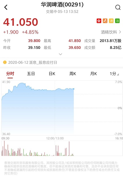 智通财经APP获悉,华润啤酒(00291)首席执行官侯孝海于本周一增持华润啤酒10万股,共涉资394.9万元。此举获美银美林及小摩看好。截至发稿,华润啤酒涨4.98%,报41.1港元,成交额8.25亿港元。