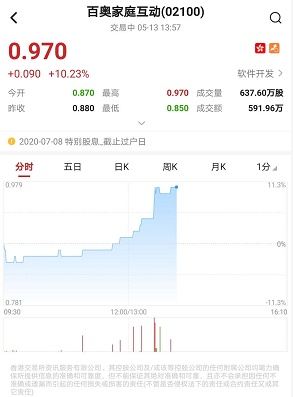 智通财经APP获悉,百奥家庭互动(02100)午后涨幅持续扩大,盘中突破多条均线,创近一个月新高。截至13时57分,涨10.23%,报价0.97港元,成交额591.96万。