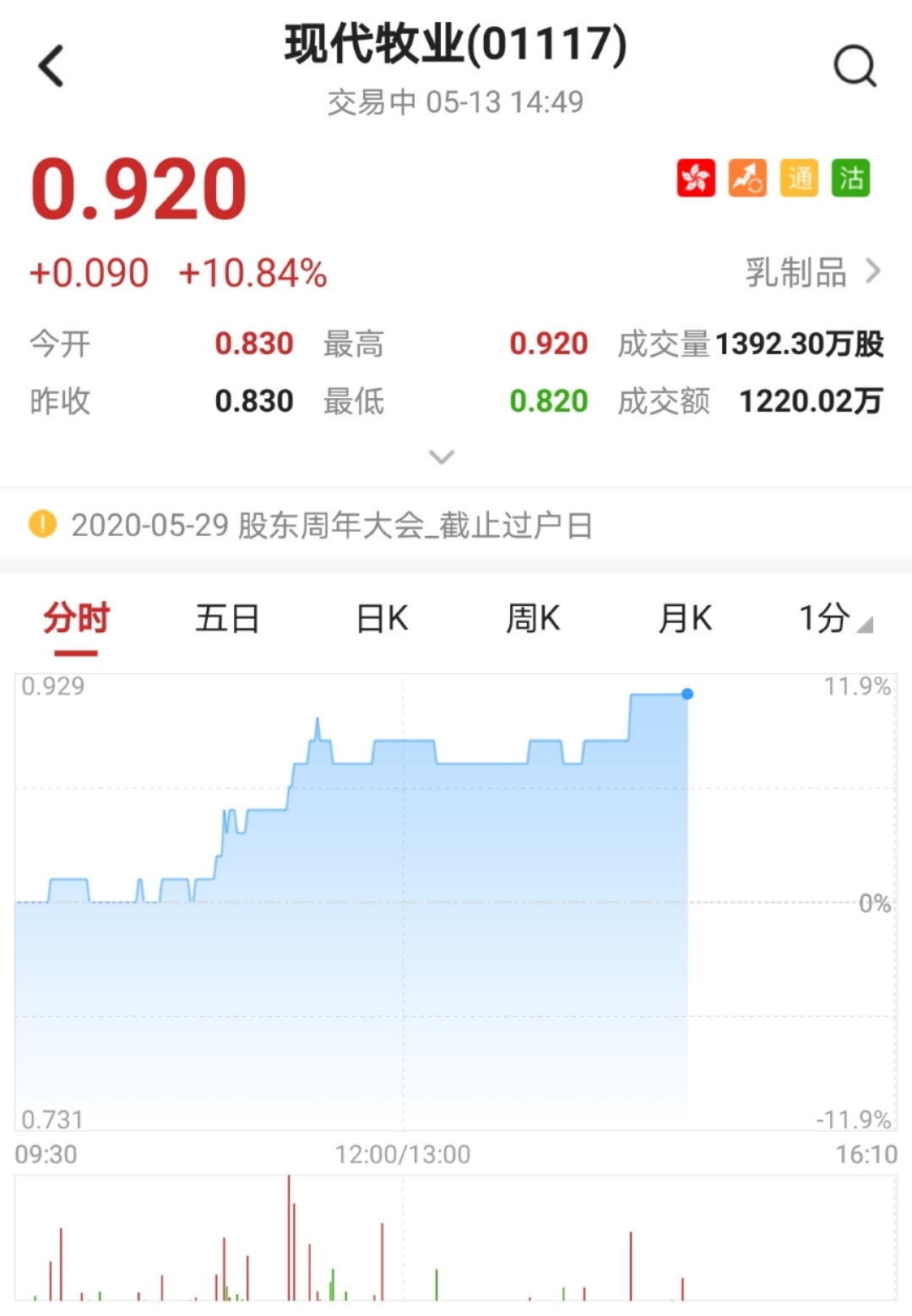 该股涨超盘中涨超10%,突破多条均线,创一个月新高。截至14时49分,涨10.84%,报价0.92港元,成交额1220.02万。