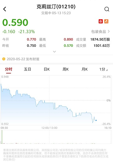 智通财经APP获悉,克莉丝汀(01210)近期成为市场资金爆炒标的,近两日内股价一度暴涨9倍。今日早盘最大曾涨18%,随后逐渐回落转跌,尾盘跌超24%,振幅达42.67%。截至发稿,跌22.67%,报0.58港元,成交额1502.21万港元。