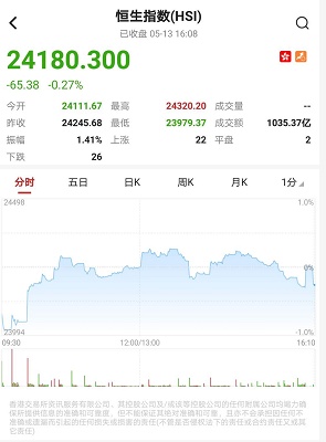 智通财经APP获悉,恒指早盘低开134.01点或0.55%,报24111.67点。盘中曾一度由跌转涨,截至收盘,恒生指数跌65.38点或0.27%,报24180.3点,全日成交额达1035.37亿。国企指数涨0.04%,报9835.71点,红筹指数涨0.11%,报3785.64点。